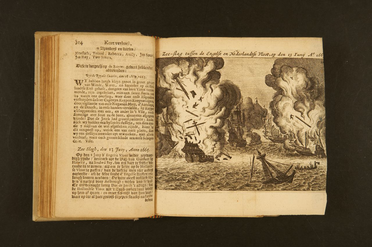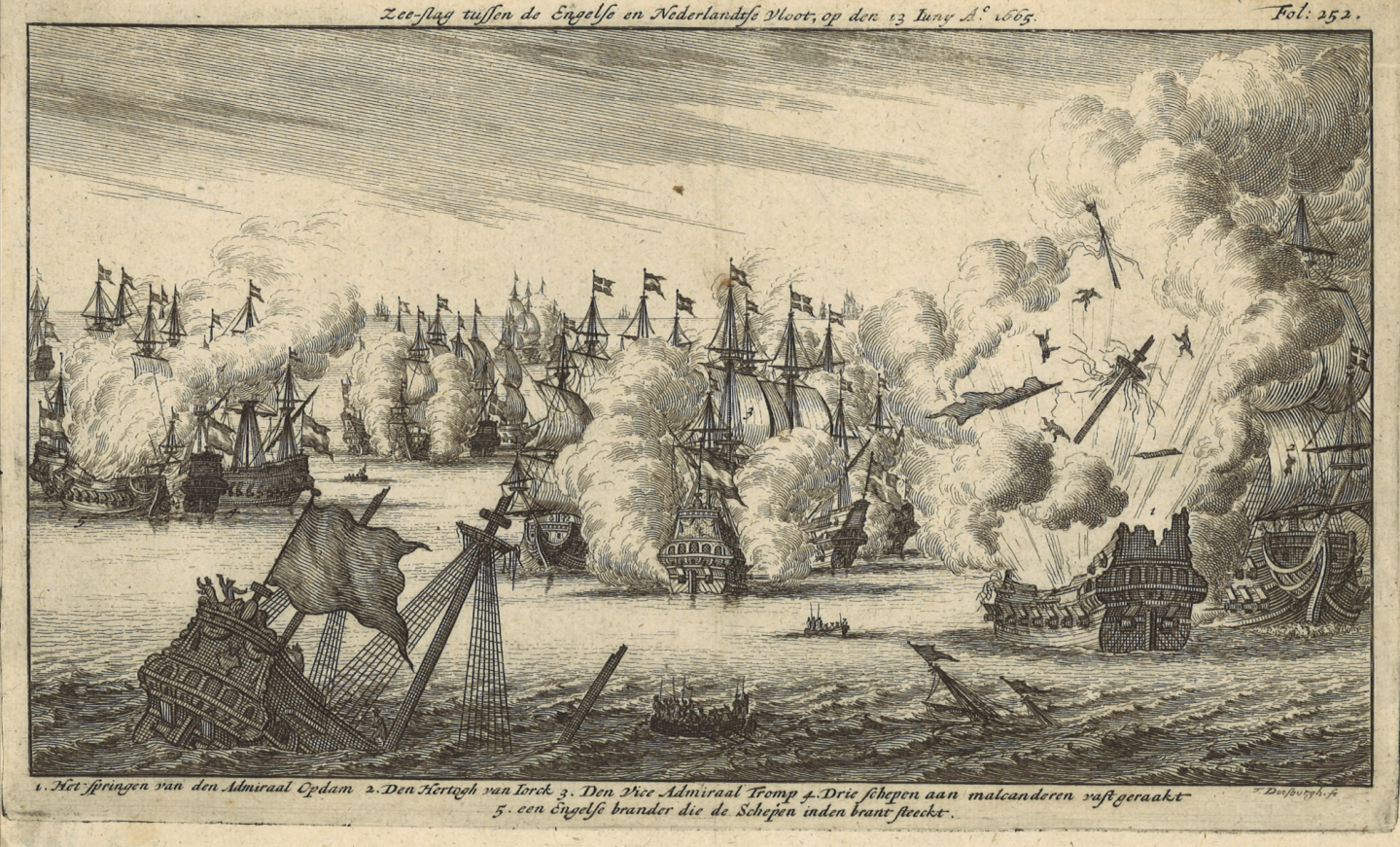 De tuigage van de Maarsseveen raakte verward met dat van andere schepen tijdens de Slag bij Lowestoft. We zien het hier links op de prent. De Engelsen staken de schepen vervolgens in brand, waarna de bemanning over boord sprong of in een sloep vluchtte. Zo ook Willemtje Gerrits. Prent uit Lambert van den Bosch, Leven en Bedryf Van den vermaarden Zeeheld Cornelis Tromp […], 1692.